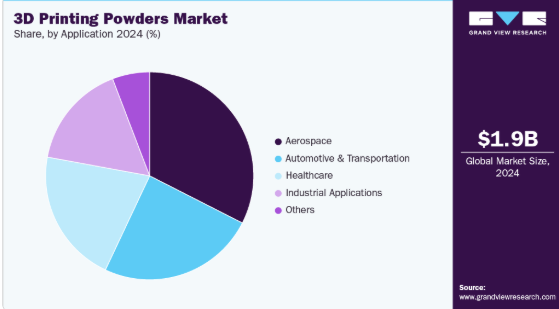 航空宇宙分野は2024年に32.5%の最高収益シェアを占めた。これはエンジン部品、構造部品、燃料ノズル、タービンブレード、卓越した耐久性と耐熱性を要する軽量アセンブリの製造において、積層造形が深く統合されているためである。特にチタン、ニッケル基超合金、アルミニウム合金などの金属粉末は、軽量化、性能向上、部品統合の利点を実現するために広く使用されています。FAAおよびEASAの認証取得の継続、AM対応航空機部品の生産増加、OEMおよび防衛請負業者による継続的な投資により、航空宇宙分野は3Dプリント粉末の最も先進的で高付加価値な消費分野であり続けています。