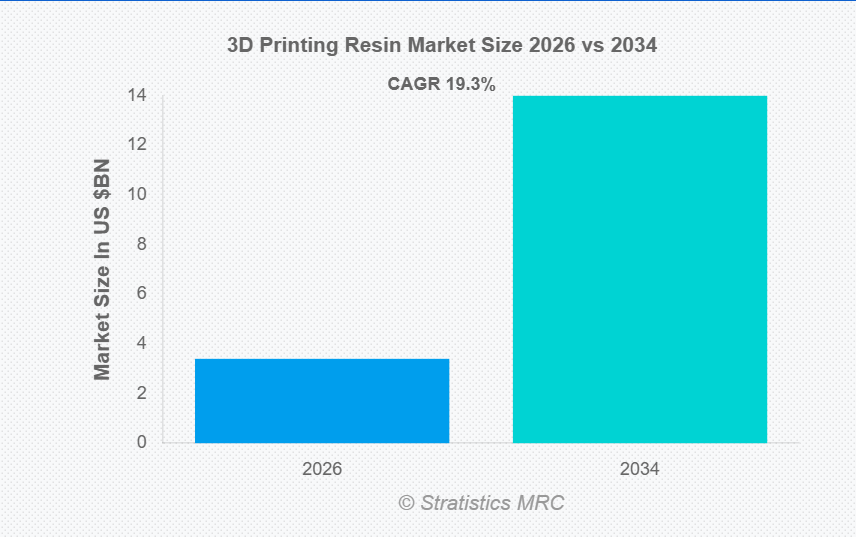 Stratistics MRCの調査によると、世界の3Dプリンティング樹脂市場は2026年に34億ドル規模となり、予測期間中に年平均成長率(CAGR)19.3%で成長し、2034年までに140億ドルに達すると見込まれています。