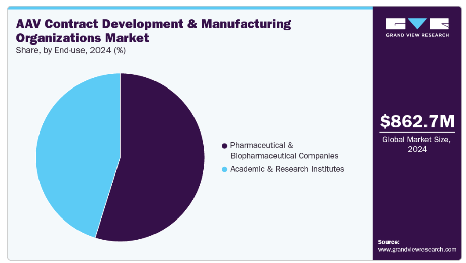エンドユースに基づき、市場は製薬・バイオ医薬品企業セグメントと学術・研究機関セグメントに区分されます。2024年には、遺伝子治療や先進的バイオ医薬品を開発する企業がAAVベクター製造を専門CDMOへアウトソーシングする傾向が強まったため、製薬・バイオ医薬品企業セグメントが最大の市場シェアを占めました。これらの企業は、臨床試験や商業化を支援するため、拡張性がありGMP準拠の生産を必要としており、CDMOとの提携が不可欠です。AAV生産の高い複雑性と、規制順守および一貫した品質の必要性が相まって、自社能力よりも経験豊富な受託製造業者への依存を促進しています。