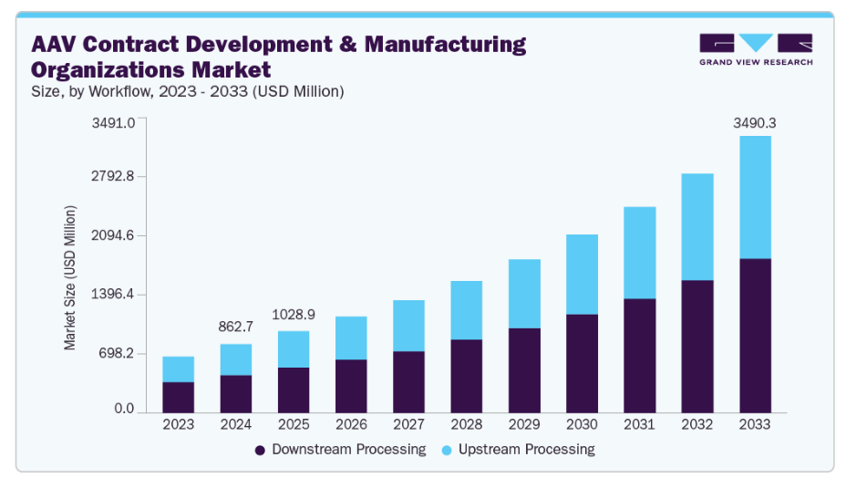 規制当局によるAAVベース療法の承認増加は、専門的な製造能力の必要性をさらに加速させています。本市場は主に、細胞・遺伝子治療パイプラインへの研究開発投資の急増によって牽引されており、AAV CDMOへの依存度を高める要因ともなっています。中小規模のバイオテクノロジー企業は、自社でのベクター開発能力が不足している場合が多く、アウトソーシングが費用対効果に優れた効率的な解決策となります。主要なCDMOは、先進的なウイルスベクター製造施設の建設、自動化プラットフォームの統合、プロセス開発、GMP製造、規制支援を含むエンドツーエンドサービスの提供を通じて、その能力を拡大しています。このサービスポートフォリオの拡大が、市場に強力な成長機会を生み出しています。