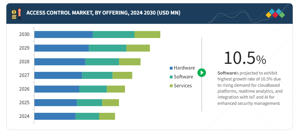 アクセス制御市場の提供セグメントは、ハードウェア、ソフトウェア、サービスで構成されています。このうち、ハードウェアが最大の市場シェアを占める見込みです。ハードウェア製品には、カードとリーダー、生体認証システム、電子錠、マルチテクノロジーリーダー、制御パネルまたはコントローラーなど、様々な種類があります。