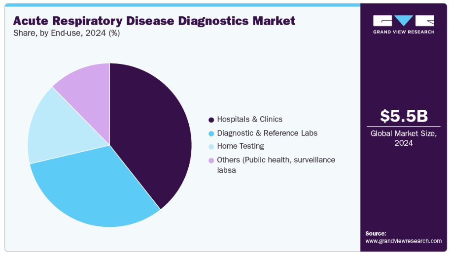 最終用途別では、2024年に病院が39.37%と最大の市場シェアを占めました。これは、急性呼吸器疾患の治療を求める患者数が多く、高度な検査室インフラが整備され、複雑な診断検査を実施できる訓練を受けた医療専門家が存在するからです。病院は日常的な症例から重篤な症例までを治療する、疾患診断・管理の主要拠点です。さらに、政府資金、償還支援、病院ベースのスクリーニングプログラムが、分子診断、PCR検査、症候群パネルの病院内導入を促進しており、市場最大の収益創出セグメントとしての地位を確固たるものにしています。