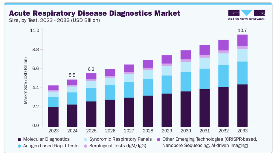【英語タイトル】Acute Respiratory Disease Diagnostics Market Size, Share & Trends Analysis Report By Test (Molecular Diagnostics, Antigen-based Rapid Tests), By Pathogen (Viral Infections, Bacterial Infections), By End-use (Hospitals & Clinics, Home Testing), By Region, And Segment Forecasts, 2025 - 2033