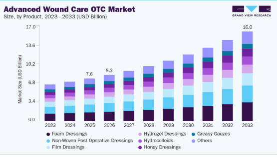 軽度の切り傷、裂傷、擦過傷、水疱、褥瘡、糖尿病性足潰瘍、火傷など様々な創傷の発生率上昇が、OTC先進創傷ケア市場の著しい成長を牽引すると予測される。多くの国々で人口の大部分がこうした損傷の影響を受けており、入手しやすく効果的な在宅治療ソリューションへの需要を後押ししている。例えば、トータル・ファミリー・ケア・センターが2025年4月に発表したデータによると、米国では年間約1,100万人が急性創傷を患っており、そのうち入院を必要とするのは約30万人にとどまります。これは、ほとんどの症例が市販製品による在宅治療で対応されていることを示しており、セルフケアや家庭使用に特化した先進創傷ケアソリューションの市場潜在力の大きさを裏付けています。