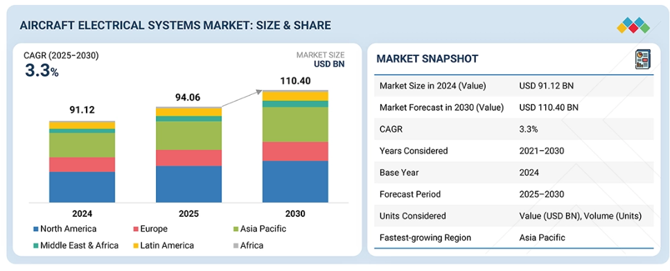 航空機電気システム市場は、2025年の940億6,000万米ドルから2030年までに1,104億米ドルへ成長し、2025年から2030年までの年間平均成長率(CAGR)は3.3%と予測されております。航空機電気システム市場は近年著しい成長を遂げております。