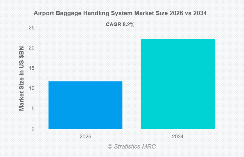 Stratistics MRCの調査によると、世界の空港手荷物処理システム市場は2026年に118億ドル規模となり、予測期間中に年平均成長率(CAGR)8.2%で成長し、2034年までに222億ドルに達すると見込まれています。空港手荷物処理システムは、空港内における旅客手荷物の輸送・管理に使用される自動コンベア、仕分け機、スキャナー、追跡ソフトウェア、検査技術を包含します。