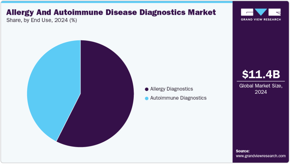 アレルギー診断セグメントは2024年に収益面で市場を牽引し、予測期間中も最速のCAGRで成長すると見込まれています。これはアレルギー疾患への認識向上と、迅速かつ正確な検査への需要拡大が背景にあります。このセグメントは、迅速性・操作容易性・臨床的精度で広く認められている免疫測定法、皮膚プリックテスト、特異的IgE血液検査の普及から恩恵を受けています。アレルギー診断は、集中型検査機関と外来診療所や家庭環境を含む分散型環境の両方に適している。自動化アレルゲンパネル、感度向上したアッセイ、デジタル解釈ツールなどの技術的進歩がセグメント成長をさらに後押ししている。家庭用キットの普及拡大と、アレルギー誘因の早期特定に対する一般の関心の高まりが相まって、このセグメントの市場ポジションを強化し続けている。簡便性、迅速性、適応性の組み合わせが、アレルギー診断を世界の主要な市場要因としている。