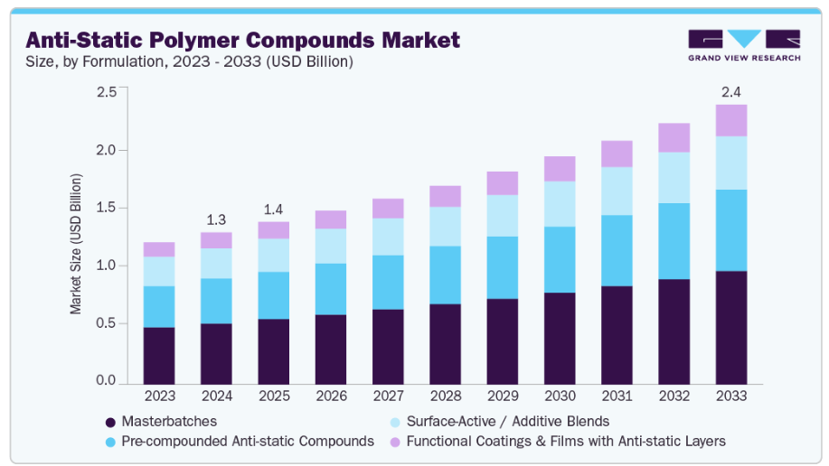 さらに、電子商取引の急速な成長により、包装メーカーは静電気制御機能を組み込んだ材料の採用を迫られています。材料と配合技術の高度化により、帯電防止ポリマーコンパウンドが実現できる性能の定義が変わりつつあります。配合技術者は、単純な表面処理を超えて、ポリマーの加工性や外観を維持しつつ長期的な性能を保つ、内部導電性かつ恒久的な帯電防止システムへと移行しています。