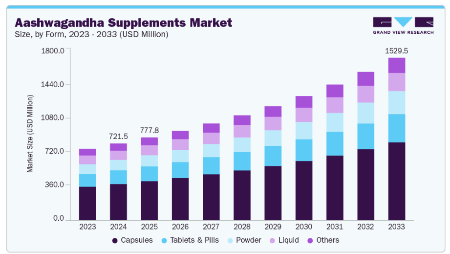 この需要を支える重要な市場動向として、伝統的な用途に対する科学的検証が進み、信頼性の高い標準化された抽出物配合(例:KSM-66、Sensoril)が実現している点が挙げられます。さらに、継続的な製品革新により、グミ、粉末、機能性飲料など多様な形態も展開されています。