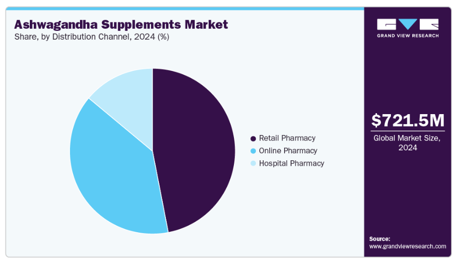 小売薬局セグメントは、2024年に46.95%の収益シェアを占めました。小売薬局は、アシュワガンダサプリメントを求める消費者にとって、手軽にアクセスでき信頼性の高いプラットフォームを提供しています。地域社会に実店舗を構えることで利便性と即時入手性を実現し、対面での買い物や薬剤師とのやり取りを好む消費者に支持されています。健康とウェルネスに関する専門知識を持つ薬剤師は、アシュワガンダサプリメントの効能、用量、潜在的な相互作用について顧客を教育する上で重要な役割を果たしています。