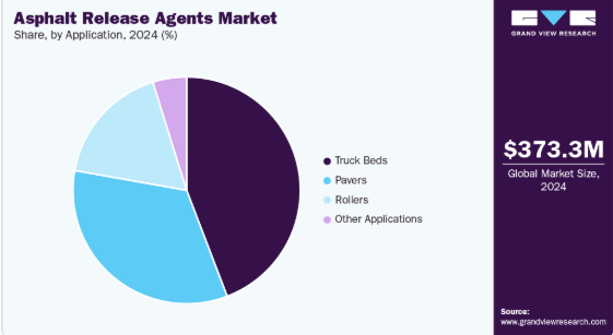 トラック荷台セグメントは、ホットミックス材料輸送時のアスファルト付着防止における重要性から、2024年に44.2%の最大収益シェアを占めた。混合プラントと舗装現場間のアスファルトの連続移動は、クリーンな排出確保、材料ロス削減、設備ダウンタイム最小化のため、効果的な離型剤への強い需要を生み出している。請負業者や車両運用事業者は、環境規制や労働安全基準を遵守しつつ優れた離型性能を提供する、即使用可能な水性バイオ製剤をますます好む傾向にある。このセグメントの優位性は、北米・欧州・アジア太平洋地域における大規模道路建設・維持管理プロジェクトでのトラック高稼働率によってさらに支えられており、アスファルト離型剤にとって最も安定かつ継続的な消費ポイントとなっている。