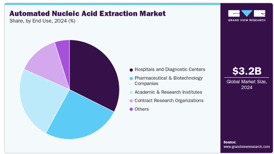 RNA抽出セグメントは予測期間中に堅調な成長が見込まれます。RNAに焦点を当てた診断、ワクチン開発、遺伝子発現プロファイリングの拡大が自動化RNA抽出技術の採用を加速させており、このセグメントは強力かつ持続的な成長が見込まれます。