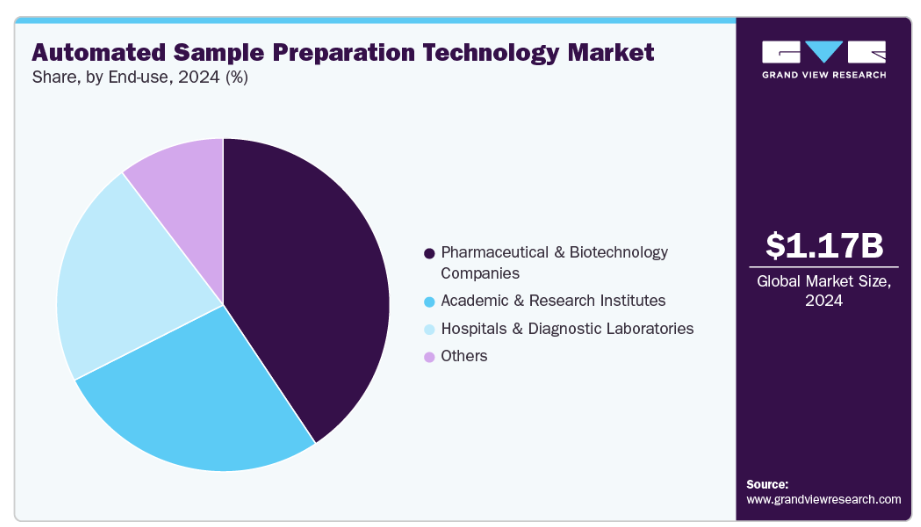 製薬・バイオテクノロジー企業セグメントは、2024年に40.64%という最大のシェアを獲得し、自動化サンプル前処理技術産業をリードしました。これは、創薬、開発、およびハイスループット研究への投資増加に起因すると考えられます。自動化サンプル前処理技術の採用拡大により、これらの企業はワークフロー効率の向上、再現性の確保、手動によるエラーの削減を実現しています。前臨床・臨床試験における迅速かつ正確なサンプル処理の必要性と、増加する研究開発費が相まって、同セグメントの市場優位性を強化し続け、自動化サンプル前処理技術産業における成長の主要な推進力としての地位を確立しています。