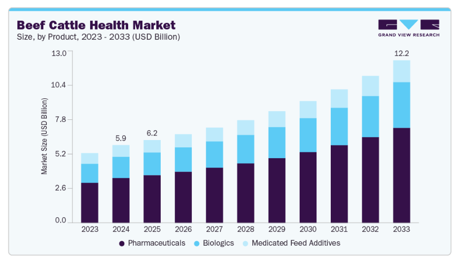 医薬品セグメントは、牛呼吸器疾患、口蹄疫、寄生虫感染症などの疾病予防・治療のための抗生物質、抗寄生虫薬、抗炎症薬に対する広範かつ継続的な需要により、2024年に最大の収益シェアを占めました。Zoetis、Elanco、Merck Animal Healthなどの企業は、家畜群の健康管理に不可欠な広域スペクトル抗生物質や注射剤を供給しています。このセグメントの優位性は、世界中の商業用牛肉生産事業において、死亡率の低減、生産性の向上、食品安全性の確保に重要な役割を果たしていることに起因します。