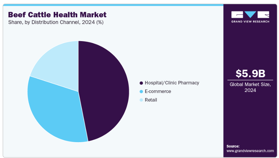 2024年時点で、病院・診療所薬局が牛肉用牛の健康産業において最大の収益シェアを占めました。この優位性は、大規模農場や獣医診療所へのワクチン、抗生物質、生物学的製剤の主要な流通拠点としての役割によって支えられています。これらの施設は、牛呼吸器疾患、口蹄疫、寄生虫感染症に対する重要な治療をタイムリーに提供しており、例えばZoetisやElancoが動物病院を通じて直接製品を供給している事例があります。専門的な指導、現地での保管、薬剤投与を提供する能力は、特に南米アメリカやヨーロッパにおいて生産者の信頼と採用を促進し、高い収益創出を持続させています。