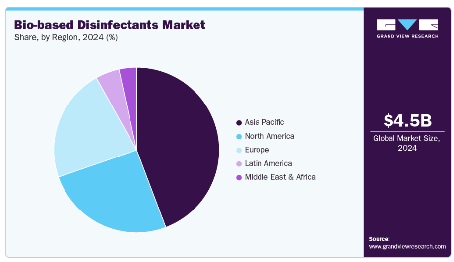 アジア太平洋地域のバイオベース消毒剤産業は、急速な都市化と家庭・商業空間におけるエコフレンドリーな清掃ソリューションの採用拡大により、2024年に44.2%という最大の収益シェアで市場を支配しました。環境持続可能性への意識の高まりと、グリーン製品を支援する政府の取り組みが、市場をさらに牽引しています。