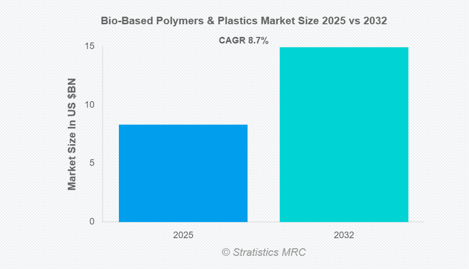 Stratistics MRCの調査によると、世界のバイオベースポリマー・プラスチック市場は2025年に83億2000万ドル規模となり、予測期間中に年平均成長率(CAGR)8.7%で成長し、2032年までに149億3000万ドルに達すると見込まれています。