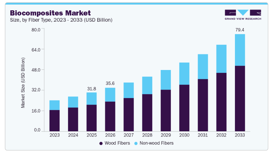 環境悪化への意識の高まりや廃棄物処理基準の厳格化に伴い、自動車、建設、包装などの産業ではバイオコンポジットの採用が活発化しています。さらに、マイクロプラスチックや長期的な汚染に対する世界的な懸念の高まりが、バイオベースのソリューションへの切り替えを後押ししています。サステナブルデザインが主流となる中、バイオコンポジットは好まれる材料選択肢として台頭しています。バリューチェーン全体も最適化が進み、コスト削減とスケーラビリティの向上が図られています。現在のトレンドとしては、高強度の天然繊維強化バイオコンポジットや、ハイブリッド型バイオ合成コンポジットの開発が挙げられます。