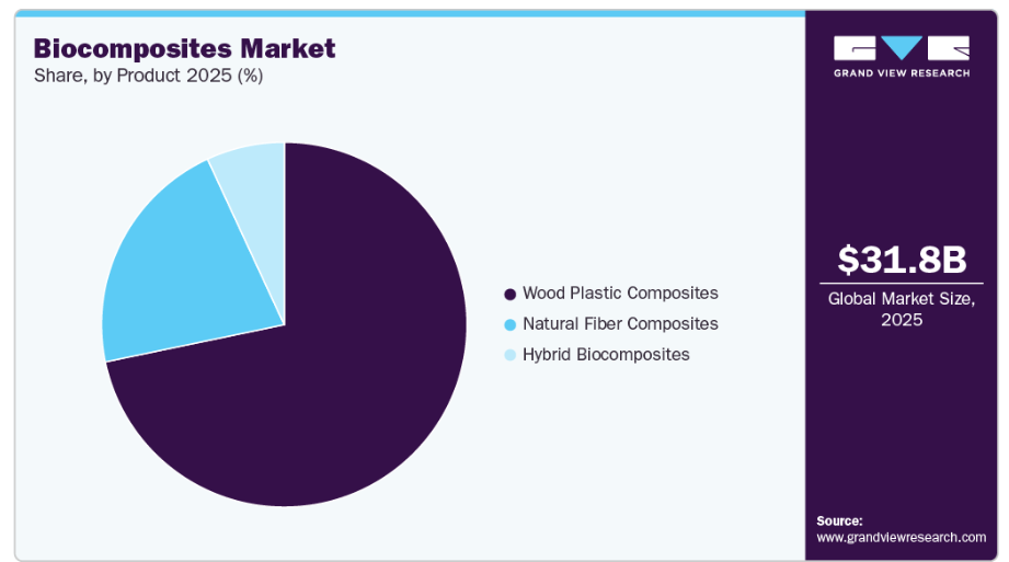 2025年時点で、木材繊維セグメントは、その広範な入手可能性、確立された加工方法、および優れた機械的特性により、68.6%という最大の売上シェアを占めました。これらは一般的に針葉樹や広葉樹を原料としており、自動車内装、建築用パネル、デッキ材、および消費財に広く使用されています。熱硬化性樹脂および熱可塑性樹脂の両方との相容性に加え、コスト効率の高さから、木材繊維は好まれる補強材となっています。主要な生産者は、木材産業の副産物である木粉、チップ、おがくずを原料としており、これによりサプライチェーンの持続可能性が高まっています。さらに、木材系バイオコンポジットは優れた寸法安定性、加工性、強度を備えており、これが様々な最終用途産業における圧倒的なシェアを支えています。