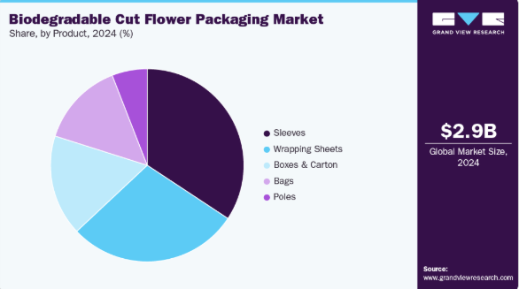 スリーブセグメントは、主にその利便性、機能性、視覚的魅力により、2024年に35.17%という最大の収益シェアで市場をリードしました。生分解性フラワースリーブは、通常クラフト紙、PLAコーティング紙、またはコーンスターチとセルロース由来の堆肥化可能バイオフィルムから作られ、茎や花びらを損傷から保護すると同時に、適切な通気性と水分バランスを維持するように設計されています。軽量で柔軟な構造は小売展示、輸送、贈答用途に最適です。花屋や小売業者は、美的表現と持続可能性を両立させるスリーブを好んで採用し、印刷されたブランドロゴや水性インクでカスタマイズして陳列効果を高めるケースが多く見られます。