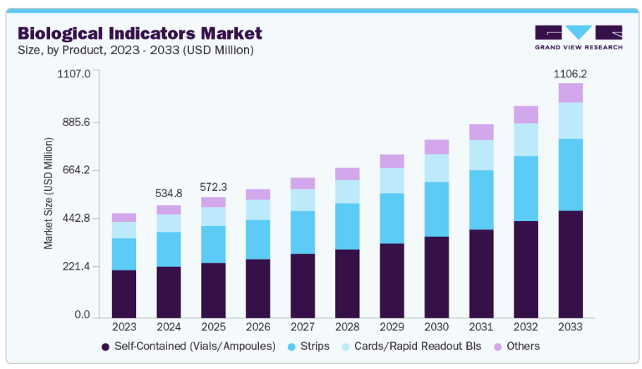 院内感染(HAI)への懸念の高まりと、滅菌プロセスの検証に関する厳格な規制要件が、信頼性が高く迅速な生物学的指標(BI)ソリューションの需要を後押ししています。さらに、迅速な読み取り技術と自動化技術の進歩、および新興市場における滅菌手段の採用増加が相まって、市場の成長をさらに加速させています。