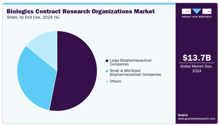 最終用途別では、2024年に大手バイオ医薬品企業セグメントが最大のシェアを占めました。このセグメントの成長は、生物学的製剤の開発に求められる複雑性と専門性の高まりによって牽引されています。モノクローナル抗体、遺伝子治療、細胞治療を含む生物学的製剤は、多くのバイオ医薬品企業が社内の専門知識を欠いているため、高度な前臨床モデル、専門的な臨床試験管理、規制に関する専門知識の需要を促進すると予想されます。さらに、CROへのアウトソーシングは開発期間の短縮、コスト削減、そして高スループットスクリーニング、専門知識、バイオマーカー解析、中枢神経系(CNS)医薬品向けの神経画像診断といった最先端技術へのアクセスを可能にします。加えて、革新的治療法や個別化医療への投資増加により、バイオ医薬品企業は製品を効率的に市場投入するため、バイオ医薬品CROへの依存度を高めています。