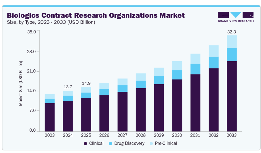 さらに、市場成長に寄与するその他の要因として、臨床試験管理における技術進歩の加速が挙げられます。これはバイオロジクスCROの業務変革をもたらしています。AI、機械学習、データ分析の統合により、患者募集の迅速化、予測モデリング、臨床試験データのリアルタイムモニタリングがさらに可能となります。加えて、デジタルプラットフォーム、電子データ収集(EDC)、分散型試験ソリューションは効率性、透明性、コンプライアンスをさらに向上させ、市場成長を牽引すると予想されます。自動化と高度なバイオインフォマティクスは、複雑な生物学的製剤研究におけるデータ処理をさらに効率化します。これらの技術は、エラー削減、意思決定の改善、試験スケジュールの加速を支援します。したがって、生物学的製剤研究がますますデータ集約型になるにつれ、ほとんどのCROは複雑性を管理し、試験成果を最適化し、革新的な治療法を迅速に市場に投入するための支援をスポンサーに提供するため、技術主導のソリューションを選択しています。
