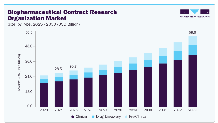 さらに、世界市場におけるバイオ医薬品企業への支出増加に伴い、拡大する研究コストとパイプラインの複雑性を管理するためのCROサービスへの需要が高まっています。加えて、バイオ医薬品、細胞・遺伝子治療分野の進歩が進む中、専門的なスキル、革新的なインフラ、規制に関する専門知識が必要とされ、バイオ医薬品CRO市場に新たな機会が生まれています。CROへのアウトソーシングにより、バイオ医薬品企業は開発スピードと品質を維持しつつ、グローバルな臨床ネットワーク、科学的専門性、コスト効率の高い運営にアクセスできます。したがって、拡大する研究開発予算に伴い、多くのスポンサーは試験設計の最適化、スケジュール短縮、財務リスク低減のためにCROに依存しています。