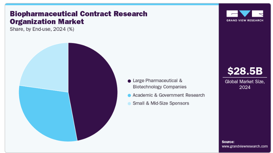 種類別では、臨床試験セグメントが最大の市場シェアを占め、2024年には収益シェアの75.78%を占めました。このセグメントは、生物学的製剤、バイオシミラー、および先進的な細胞・遺伝子治療に対する需要の高まりによって牽引されています。セグメント成長に寄与するその他の要因としては、分散型・デジタル臨床試験モデルの採用拡大、研究開発の複雑化、試験設計・データ分析・規制コンプライアンスにおける専門知識の需要増加が挙げられます。これらはバイオ医薬品企業が臨床業務を外部委託する動きを促進しています。
