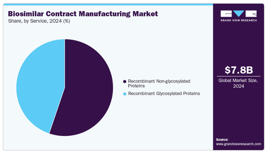 2024年、バイオシミラー受託製造市場において、組換え非糖化タンパク質セグメントが最大の収益シェアを占めました。その理由は、生産プロセスの効率化、製造コストの低さ、インスリン、成長ホルモン、サイトカインなど幅広い治療用途にあります。糖化タンパク質とは異なり、これらのタンパク質は複雑な発現システムを必要とせず、規制面および技術面の課題を軽減します。効率的で拡張性があり、コスト効率の高いバイオシミラーソリューションを求める製薬企業からの高い需要が、このセグメントの成長をさらに促進しています。加えて、慢性疾患の有病率の増加と世界的な生物学的製剤の採用拡大が、組換え非糖化タンパク質への選好を強化し、市場最大のセグメントとしての地位を確固たるものにしています。