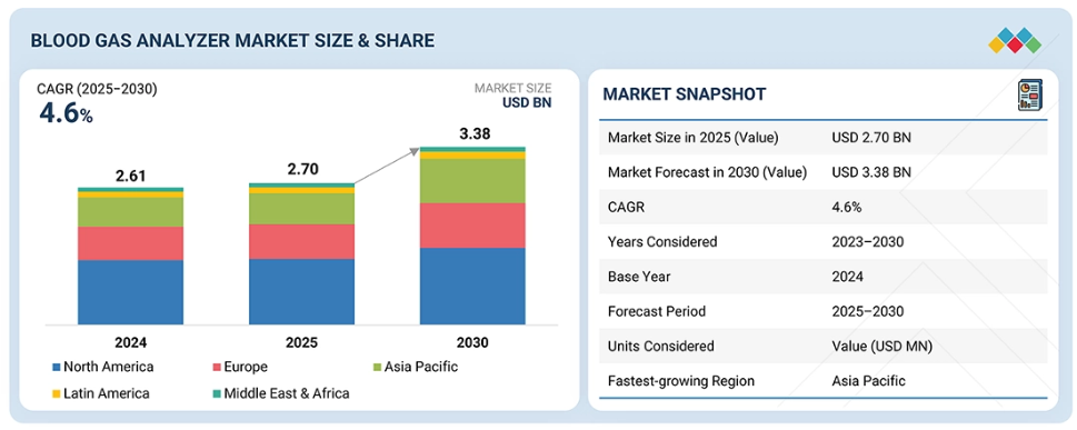 血液ガス分析装置市場は、2025年に27億米ドルと推定され、2030年までに33億8,000万米ドルに達すると予測されています。予測期間中は年平均成長率(CAGR)4.6%で成長が見込まれます。