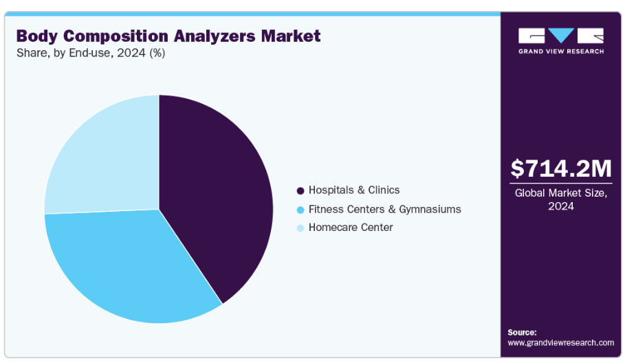 2024年、生体電気インピーダンス分析装置(BIA)セグメントは、その精度、非侵襲性、使いやすさから21.7%のシェアで市場をリードしました。これらの装置は生体電気インピーダンス分析(BIA)技術を活用し、体脂肪、筋肉量、骨密度、全身水分量の迅速な評価を提供するため、病院、クリニック、フィットネスセンターに最適です。健康意識の高まり、予防医療の取り組み、肥満や代謝性疾患の増加が需要を後押ししています。さらに、携帯型分析装置やモバイルアプリとの連携によるリアルタイム追跡といった技術的進歩が、ユーザーの関与と普及を促進しています。手頃な価格と拡張性も、このセグメントが世界的に主導的な市場地位を維持する要因となっています。