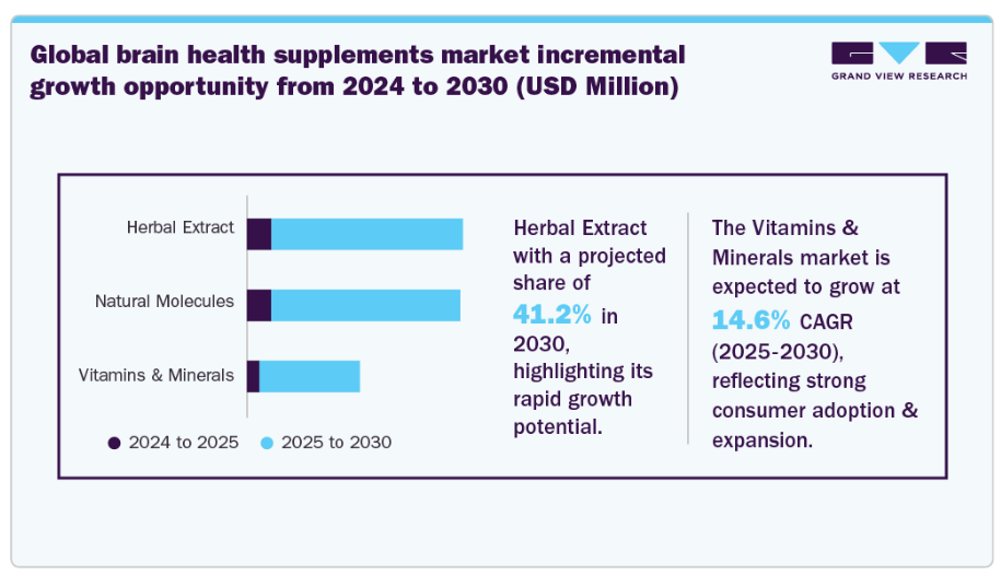 ストレス・不安対策分野は、2025年から2030年にかけて14.6%という最も高いCAGRで成長すると予測されています。ストレスや不安管理における脳健康サプリメントの需要増加は、過酷な職場環境、学術上のプレッシャー、社会経済的な不確実性など、世界的に高圧的な環境に晒される機会が増加していることが主な要因です。慢性的なストレスと不安は、認知機能障害、睡眠障害、健康状態の全般的な悪化に大きく寄与する要因として認識されており、予防的・支援的介入を求める動きが加速しています。2025年9月にWHOが発表した報告書によれば、不安障害は世界で最も一般的な精神疾患であり、2021年には約3億5900万人が罹患しており、女性の方が男性よりも罹患率が高い傾向にあります。