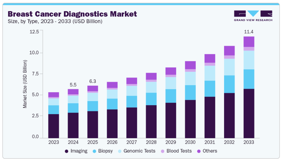 【英語タイトル】Breast Cancer Diagnostics Market Size, Share & Trends Analysis Report By Product (Platform-based, Instrument-based), By Type (Imaging, Biopsy, Genomic Tests, Blood Tests), By Application, By End-use, By Region, And Segment Forecasts, 2025 - 2033