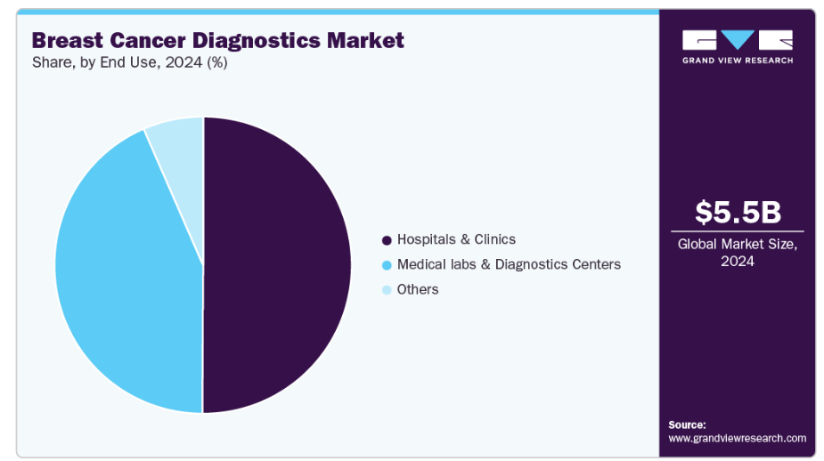 診断・予測セグメントは市場を牽引し、2024年には48.69%という最大の収益シェアを占めました。診断アプリケーションは、乳がんの早期段階での存在を特定する上で極めて重要な役割を果たします。早期発見により適切な時期の介入が可能となり、治療成果の向上と死亡率の低減につながります。マンモグラフィー、超音波検査、MRIなどの診断手法は、乳房組織の異常を検出するのに役立ち、医療提供者が正確な診断を下すための指針となります。この分野における最近の進展として、2023年1月に発表された研究で披露された液体生検検査の開発が挙げられます。これは循環腫瘍DNAを利用し、高い精度で早期乳がんを検出します。