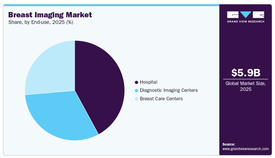 2025年時点では、病院がエンドユースセグメントを支配しました。病院内に高度で設備の整った乳房画像診断施設が存在することは、入院期間、総医療費、医療の質、緊急医療の可用性など、様々な要素に好影響を与えます。世界的に医療構造への投資が増加していることから、この傾向は今後数年間の市場拡大に寄与するでしょう。投資により、改善されたインフラと診断機器の調達が可能となりました。また、病院を基盤とする全ての医療サービスにおいて、良好な医療保障を提供することにも効果を発揮しています。これらは今後数年間における病院セグメントの成長に寄与する主要な要因です。