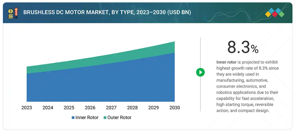 今後10年間において、モーター制御技術の進歩、産業の自動化、電気自動車の普及により、ブラシレスDC(BLDC)モーター市場は著しい成長が見込まれます。省エネルギー、低メンテナンス、高性能ソリューションへの関心の高まりが、民生用電子、自動車、製造、医療機器など経済の多くの分野におけるBLDCモーターの普及を促進しています。高い効率性、長寿命、精密な制御性能により、信頼性と持続可能性が求められるあらゆる用途において不可欠な存在です。スマート製造、グリーンモビリティ、コネクテッドデバイスの急速な変化は、BLDCモーターを現代の技術革新を支える基盤技術とする潮流を加速させ、産業における大規模な変革の前提条件を形成しています。