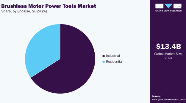 産業セグメントは市場を支配し、2024年には65.9%という最大の収益シェアを占めた。これは、製造、自動車、建設産業における連続運転に耐えうる信頼性の高いヘビーデューティ工具への需要増加が要因である。ブラシレスモーター電動工具は、寿命の延長、ダウンタイムの削減、最小限のメンテナンスコストから好まれる。工具追跡と性能分析のためのデジタル接続性の統合は、産業環境における生産性と安全性を向上させる。さらに、自動化とエネルギー最適化への世界的注目が高まる中、産業分野では空圧式から電気式ブラシレスシステムへの移行が進んでいる。