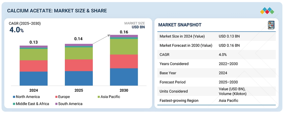 酢酸カルシウム市場は、予測期間中に年平均成長率(CAGR)4.0%で成長し、2025年の0.14億米ドルから2030年までに0.16億米ドルに達すると見込まれております。