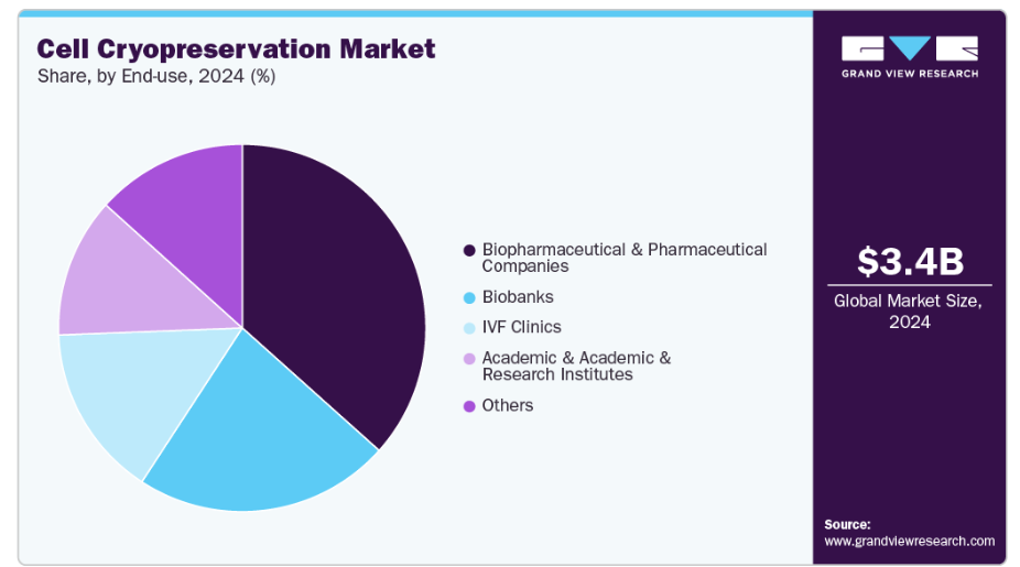 2024年時点で、バイオ医薬品および製薬企業が世界の細胞凍結保存市場において最大のシェアを占め、市場の36.63%を占めております。先進的な細胞治療、再生医療、生物学的製剤市場の成長がこの分野を後押ししており、これらの製品は細胞の生存率と機能を維持するために高品質で効果的な凍結保存オプションを必要としています。