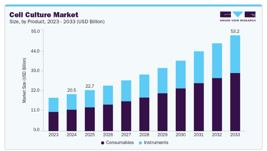 【英語タイトル】Cell Culture Market Size, Share & Trends Analysis Report By Product (Consumables, Instruments), By Application (Biopharmaceutical Production, Drug Development, Tissue Culture & Engineering, Cell & Gene Therapy, Toxicity Testing), By Region, And Segment Forecasts, 2025 - 2033