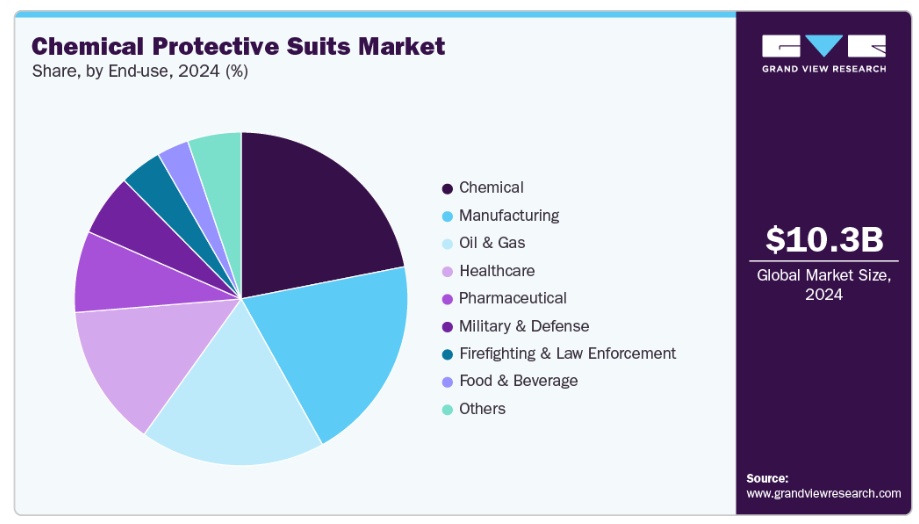 化学セグメントは、有害物質への頻繁な曝露により、2024年に21.9%という最大の収益シェアで市場をリードしました。化学製造・加工プラントの作業員は高度な保護を必要とします。厳格な安全規制とコンプライアンス基準が防護服の継続的な採用を促進しています。事故や化学物質汚染を防止する必要性が、耐久性と信頼性に優れた防護服の安定した需要を確保しています。