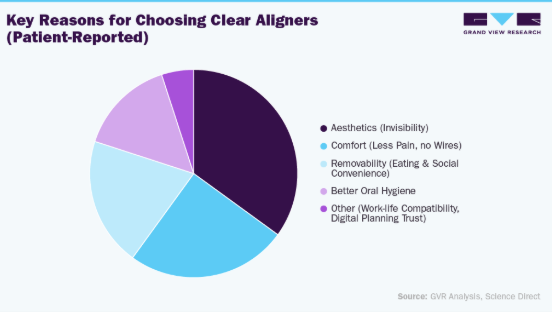 2025年時点で成人セグメントが最大の市場シェアを占めた背景には、未治療の不正咬合の持続と審美意識の高まりがある。2024年7月『American Journal of Orthodontics and Dentofacial Orthopedics』掲載論文「成人矯正治療:治療動機、装置選択、治療体験」によれば。この調査ベースの研究は、成人が矯正治療を受ける理由と各種装置タイプに関する体験を検証した。多くの成人患者が固定式矯正装置より透明アライナーを好むことが判明し、その理由として審美性の高さ、衛生管理の容易さ、生活様式との適合性が挙げられた。この結果は、外観・利便性・快適性を背景としたアライナー療法への成人需要の高まりを裏付けている。