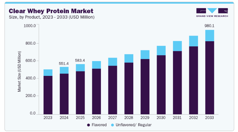 さらに、フィットネス文化の台頭やジム会員の増加、フィットネスインフルエンサーやオンラインワークアウトコミュニティの普及により、特に活動的な人々の間でプロテイン補給の利点に対する認識が高まっています。従来型のホエイプロテインパウダーと比べて軽い食感でカロリーも低いクリアホエイプロテインは、不要な添加物や過剰な糖分を摂取せずに筋肉量を維持したい方々に支持されています。こうした背景から、栄養価と味の両方を重視する健康志向の消費者層において、クリアホエイは好まれる選択肢としての地位を確立しています。