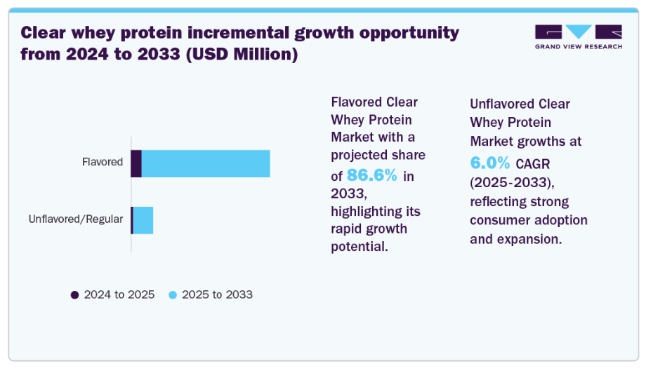 - 製品別では、フレーバー付きクリアホエイプロテイン市場が市場を牽引し、2024年には85.8%のシェアを占めました。