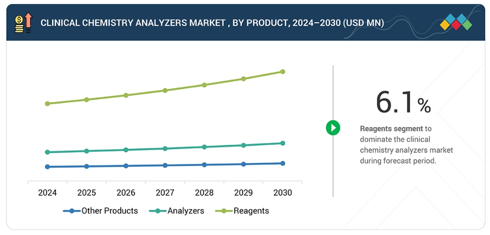 - 臨床化学分析装置市場において、製品種類別では、試薬セグメントが6.1%という最も高い年平均成長率(CAGR)を記録すると予測されています。