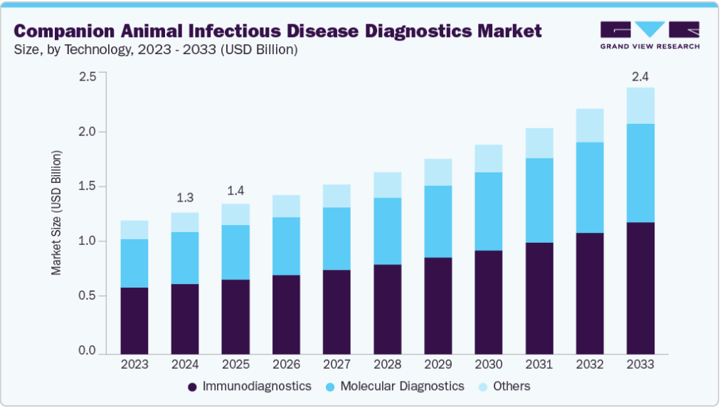 免疫診断セグメントは、高い感度、迅速な結果提供時間、様々な動物種や病原体への幅広い適用性により、2024年に49.65%という最大の収益シェアで市場をリードしました。酵素免疫測定法(ELISA)、ラテラルフローアッセイ、免疫蛍光法などの技術は、犬パルボウイルス、牛結核、猫白血病ウイルス(FeLV)などの感染症に関連する特定の抗原や抗体を検出するために、臨床現場と野外調査の両方で広く使用されている。例えば、ELISAキットは動物病院で定期健診時の猫のFeLVスクリーニングに日常的に使用され、ラテラルフロー検査は急性胃腸症状を示す子犬におけるパルボウイルスの迅速診断を可能にする。これらの検査は費用対効果が高く、操作が容易で、数分以内に結果が得られることが多く、高スループットスクリーニングや早期発見に理想的であるため、免疫診断は伴侶動物感染症診断市場の基盤として確固たる地位を築いている。