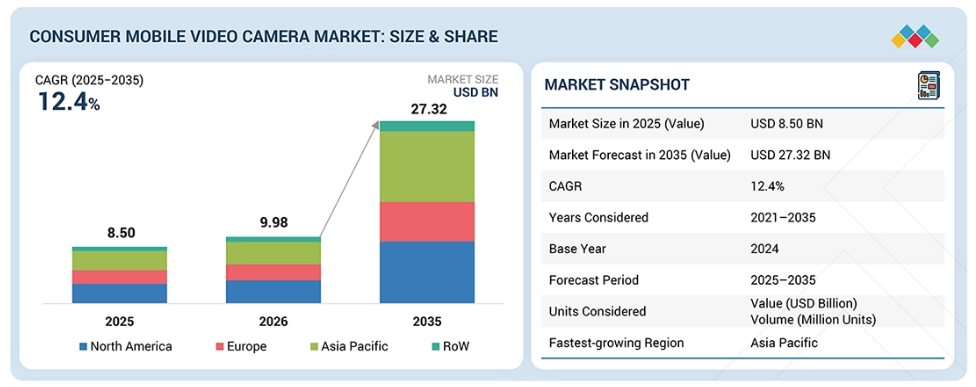 世界の消費者向けモバイルビデオカメラ市場は、2025年に85億米ドルと推定され、2035年までに273億2,000万米ドルに達すると予測されています。2025年から2035年にかけて年平均成長率(CAGR)12.4%で成長する見込みです。