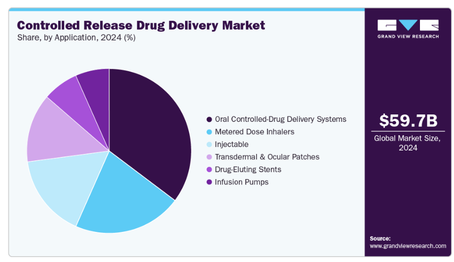 • 用途別では、経口制御薬物送達システムセグメントが2024年に最大の市場収益シェアを占めました。