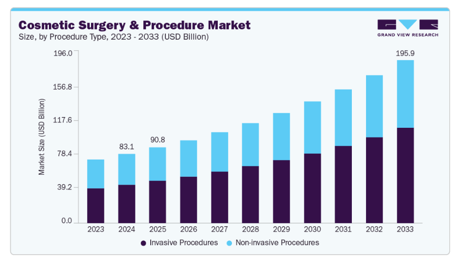 ソーシャルメディアの影響力拡大と美の基準の変遷は、美容整形手術・施術市場を牽引する重要な要因となっています。Instagram、TikTok、YouTubeなどのプラットフォームが美の概念を形成する中、人々はこれまで以上に、完璧な肌、対称的な顔立ち、若々しい外見を強調する、編集された画像、有名人の変身、美容トレンドに触れる機会が増えています。この絶え間ない視覚的刺激は、自己認識を高め、理想化された外見を模倣したいという欲求を強めています。そのため、より多くの人々が、現在の美容トレンドに自分の外見を合わせるために、皮膚充填剤、ボトックス、唇のボリュームアップ、顔の輪郭整形などの美容整形を求めるようになっています。